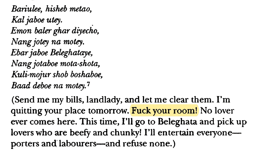 It seems that among the upper- and middle-class Muslim prostitutes, the commerce of sex was interwoven with cultivation of skills in north Indian classical music. The Bengali Hindu baijis also shared the same training in those skills. Muslim baijis were quite often employed by Hindu women in the red-light areas to train their daughters in classical music. For instance, the famous actress Binodini, when she was eight years old, was apprenticed by her mother to a Muslim baiji, through whom she was introduced to impresarios who recruited her for the theatre. […] Their main source of livelihood was their expertise in singing and dancing in the classical north Indian mode.